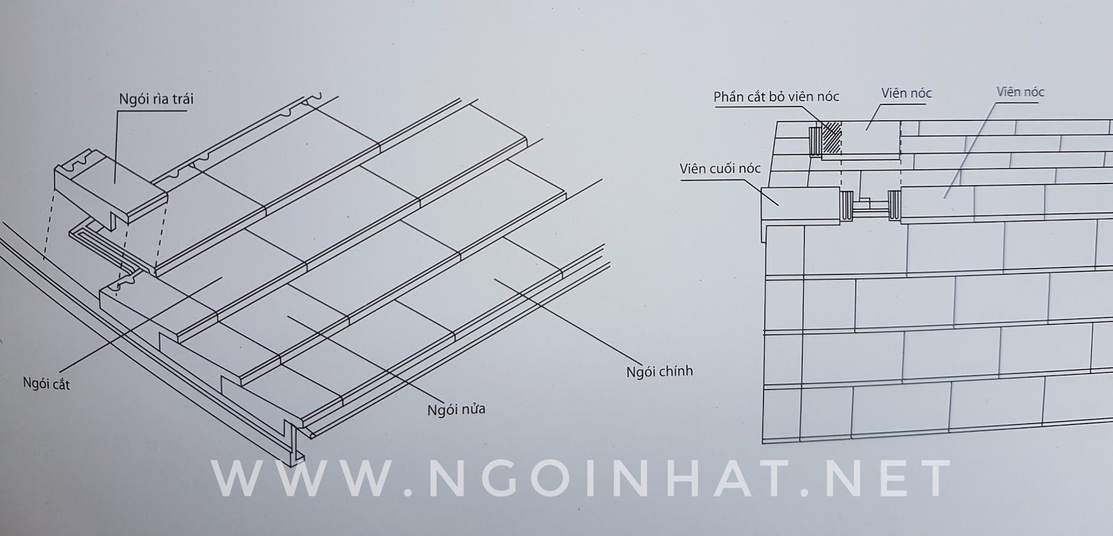 - Lợp viên ngói rìa phải ở hàng dưới cùng đầu tiên, sau đó lợp các viên ngói chính tiếp theo sau cùng là viên rìa trái. Trong trường hợp viên ngói chính cuối cùng vừa đủ. Nếu dư hoặc thiếu chúng ta lấy viên ngói chính cắt tùy theo khoảng cách từ viên ngói chính tới viên rìa trái