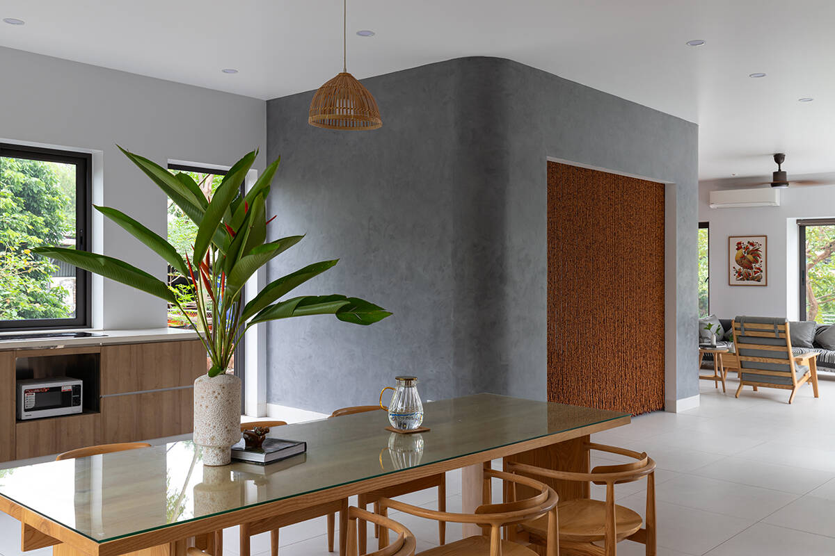 Nội thất bên trong được giữ ở mức tối giản, vừa đủ để gợi sự thư thái và thoáng đãng. Ánh sáng tự nhiên được dẫn dắt khéo léo qua các ô cửa và khoảng trống, tạo nên những lớp không gian biến chuyển mềm mại trong ngày.