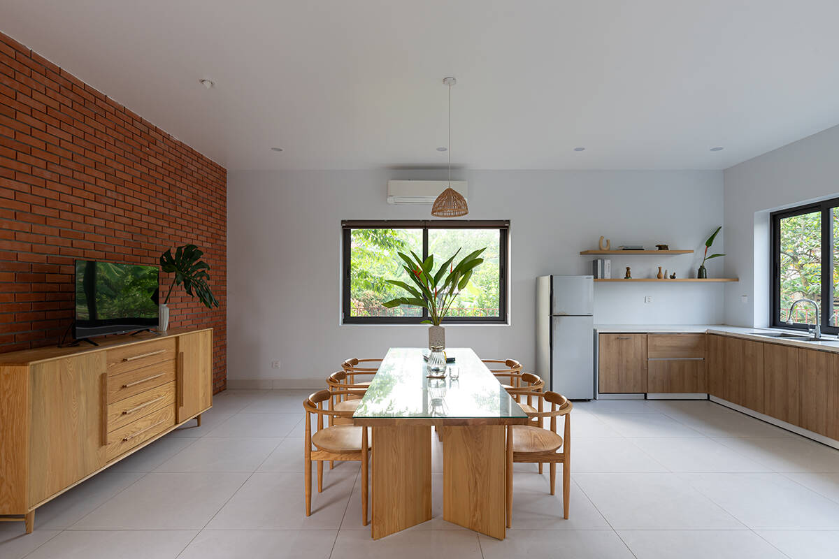 Mái hiên lớn bao quanh công trình là khoảng đệm chuyển tiếp giữa trong và ngoài. Các khung cửa mở rộng hướng ra vườn giúp xóa mờ ranh giới giữa nội thất và cảnh quan. Nhờ đó, mọi không gian sử dụng đều có mối liên hệ với khu vườn, khuyến khích sự tương tác và gắn bó giữa các thành viên.