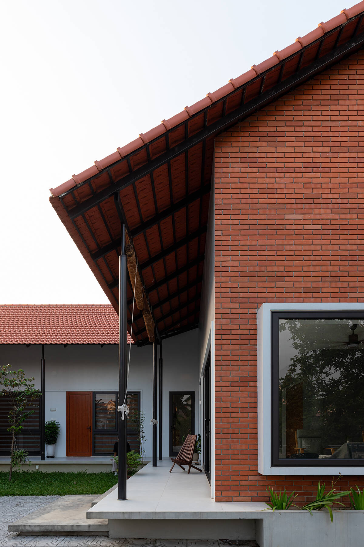 Mái ngói dốc truyền thống kết hợp với các khối hộp hiện đại, tạo nên một diện mạo vừa quen thuộc vừa mới mẻ. Tường nhà trang trí bằng gạch thẻ đỏ tươi của Công ty cp Viglacera Hạ Long. Gạch thẻ cotto Của công ty CP Viglacera Hạ Long